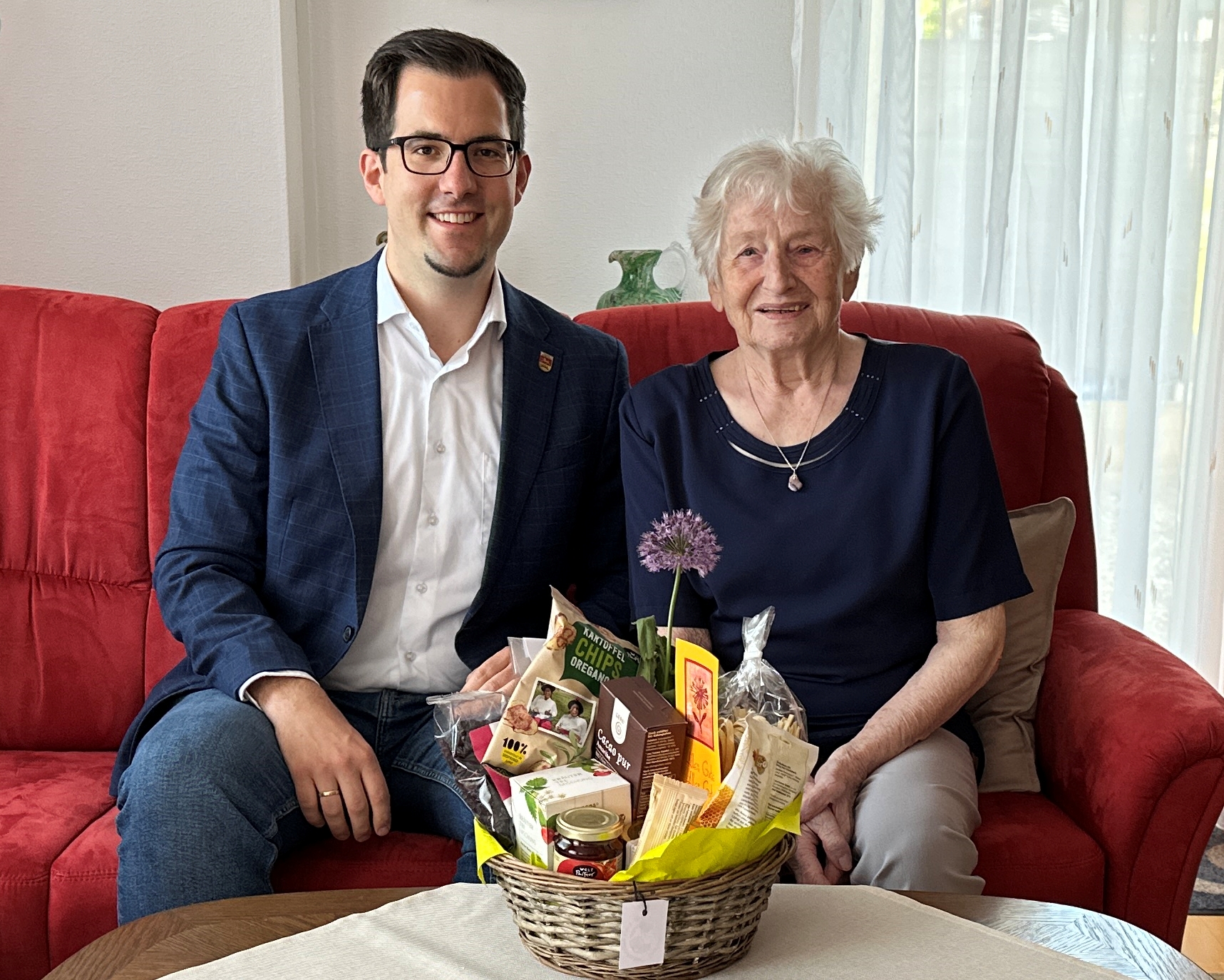 Ebenso zu den Jubilaren gehörte Frau Erika Kurz. Auch sie durfte sich über einen Besuch unseres Bürgermeisters an ihrem Ehrentag am Mittwoch, 14.05.25, freuen. Als Geschenk der Gemeinde bekam auch sie einen Geschenkkorb und die Urkunde des Ministerpräsidenten überreicht.