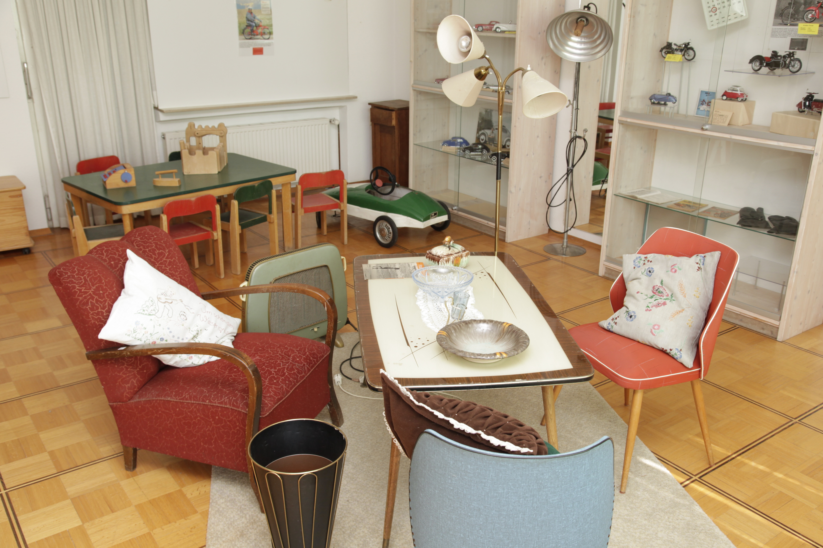 Viel Atmosphäre vermitteln Inszenierungen, in die der Besucher integriert wird: Etwa eine alte Schulstube mit ihren erlebbaren harten Bänken. Oder ein Fabriksaal mit ratternden Strickmaschinen. Schließlich auch eine nachgebaute Gastwirtschaft mit Grammophon und Jukebox, in welcher der Förderkreis Heimatgeschichte zu den Öffnungszeiten mit Kaffee, Kuchen sowie diversen anderen Getränken bewirtet. Wechselausstellungen sorgen dafür, dass sich ein Besuch auch zum wiederholten Male lohnt.