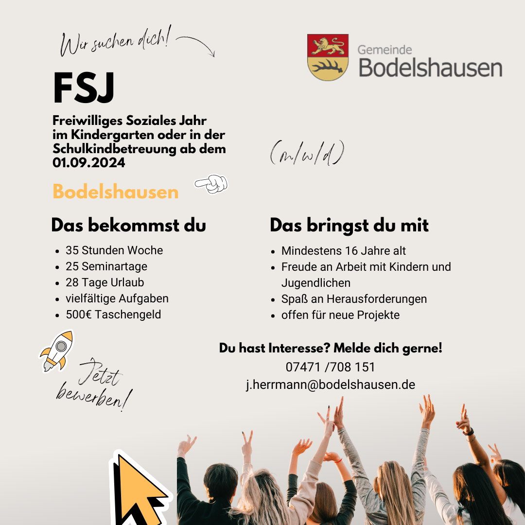 Im Amt für Kinder, Jugend und Familie der Gemeinde Bodelshausen bieten wir 5 Stellen für den Freiwilligendienst (Bundesfreiwilligendienst und Freiwilliges Soziales Jahr) an.