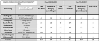 Die Betreuungskapazität für die Kinder im Kindergartenalter wird nach den vorliegenden demografischen Daten die nächsten drei Jahre voraussichtlich ausreichen.