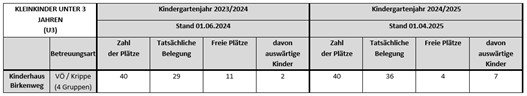 Im Kinderhaus Birkenweg werden 4 Krippengruppen mit verlängerten Öffnungszeiten angeboten. Anfang April im aktuellen Kindergartenjahr wurden 36 Kinder unter drei Jahren in der Einrichtung betreut (im letzten Jahr waren im Juni 29 Plätze belegt).