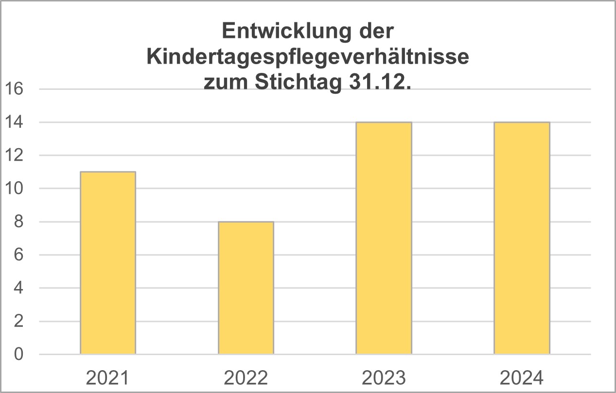 Im Jahr 2024 waren in Bodelshausen 4 Tagesmütter tätig, die insgesamt 14 Kinder betreuten. Wie bereits in den Vorjahren waren es die unter 3-Jährigen, für die die Betreuung bei Kindertagespflegepersonen gerne gewählt wurde.