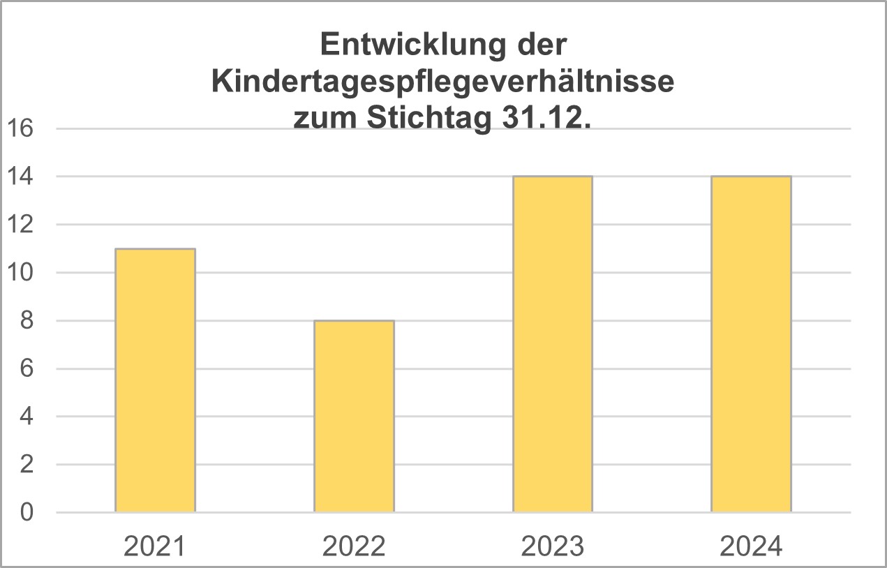 Im Jahr 2024 waren in Bodelshausen 4 Tagesmütter tätig, die insgesamt 14 Kinder betreuten. Wie bereits in den Vorjahren waren es die unter 3-Jährigen, für die Betreuung bei Kindertagespflegepersonen gerne gewählt wurde.