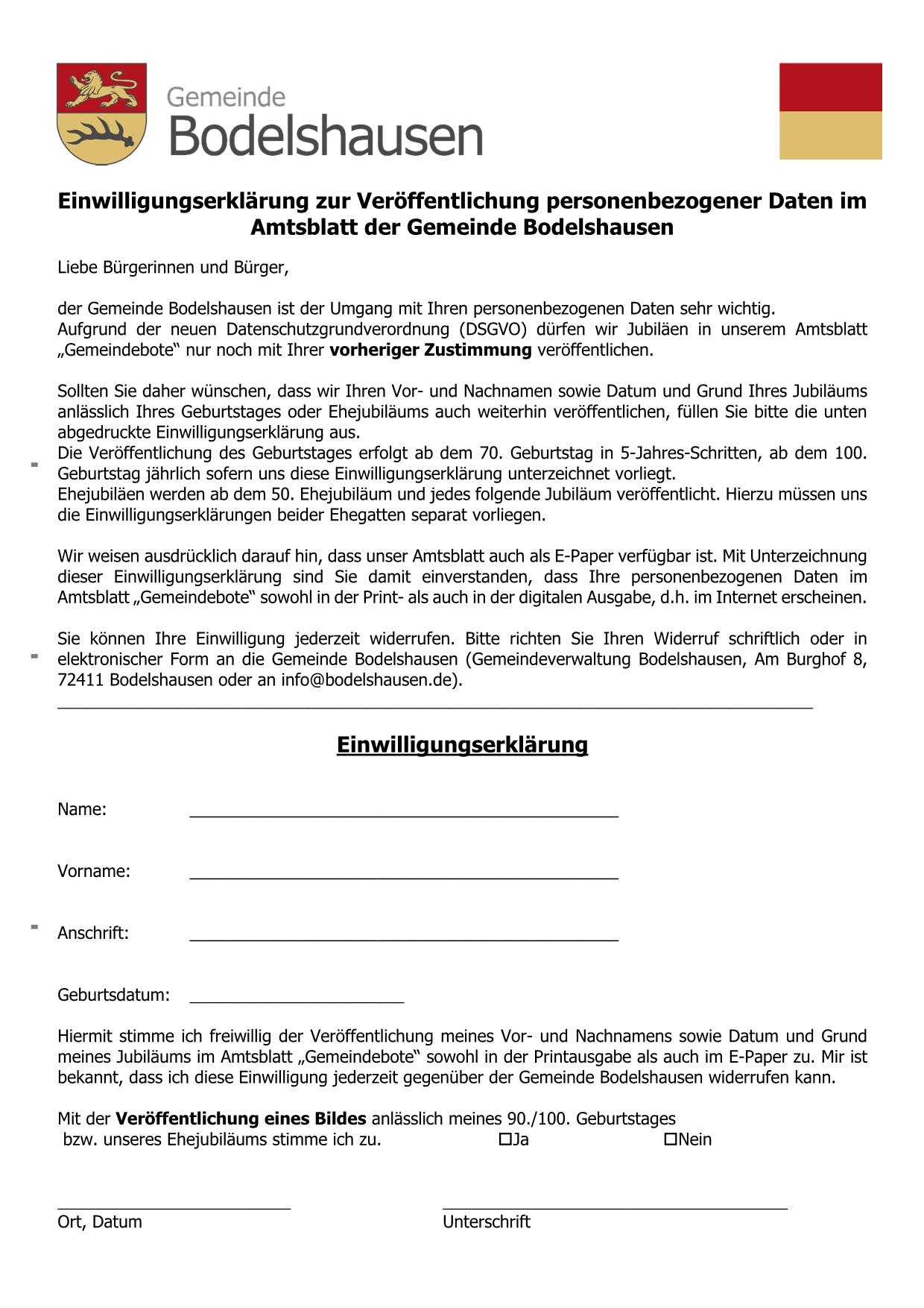 Einwilligung zur Veröffentlichung personenbezogener Daten im Amtsblatt der Gemeinde Bodelshausen