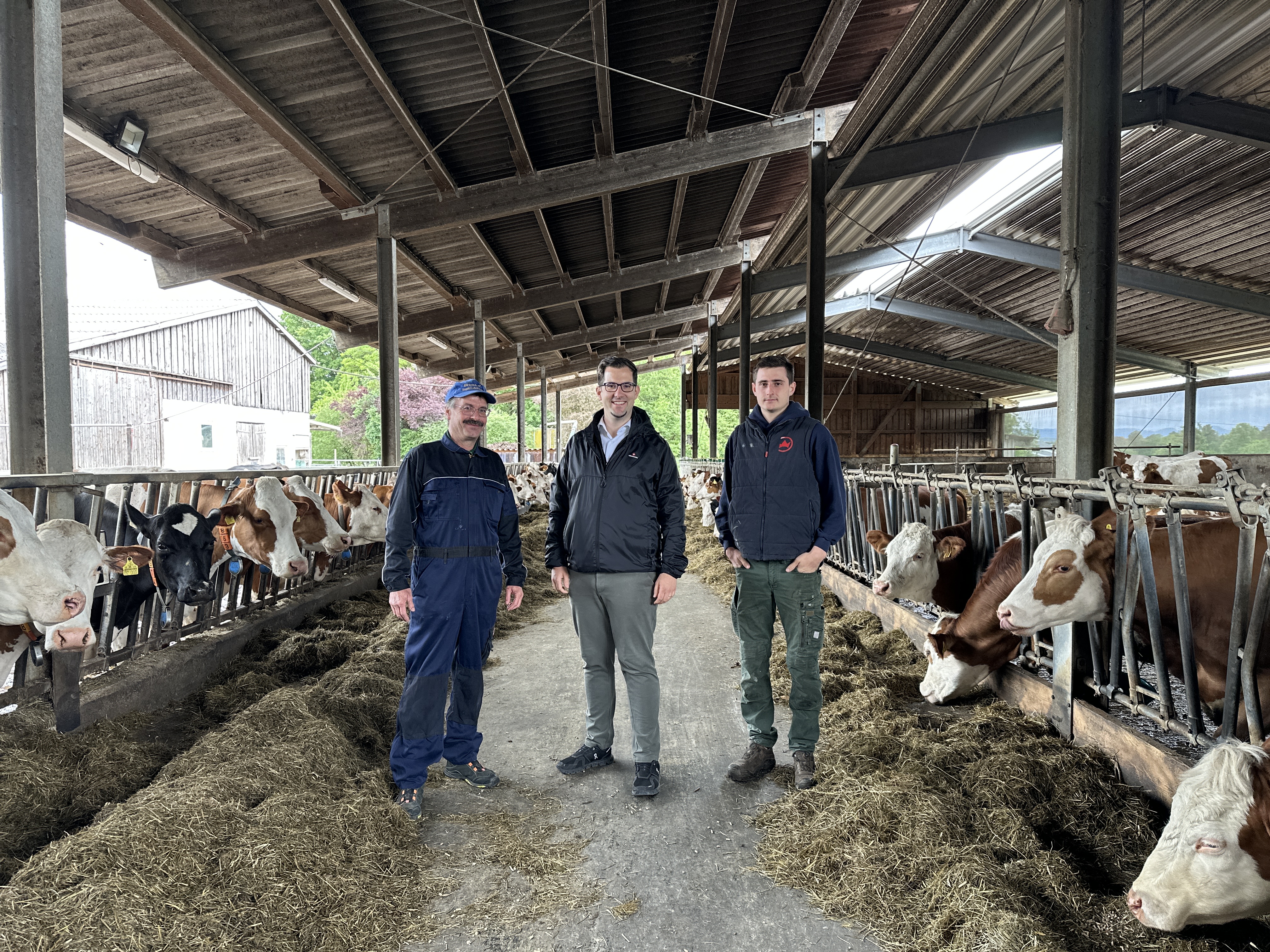 Gemeinsam mit Landwirt Thomas Schäfer und dessen Sohn Marco tauschte sich Bürgermeister King ausführlich über die Zukunft der ökologischen Landwirtschaft aus. Dabei wurde deutlich, wie moderne Milchviehhaltung im Einklang mit Tierwohl, Umweltbewusstsein und regionaler Verantwortung gelingen kann.